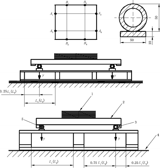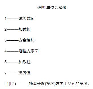 ●加載布(bù)置:兩根加載杠對稱置於底鋪(pù)板上,加載杠中心距托盤外側墊塊或縱梁的內側邊為0.25L1或0.25L2(L1、L2為托盤長度與寬度);加載杠可伸出鋪板或與外緣平齊。
