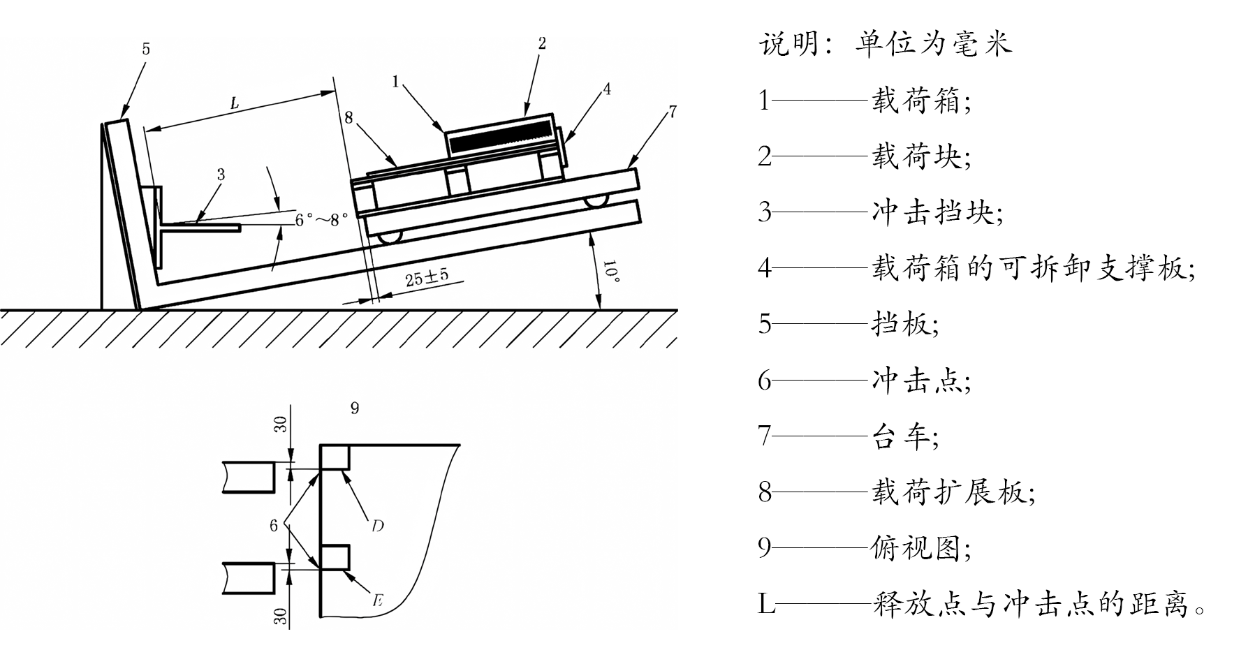 在進行具體的試驗操作(zuò)時,首先需采用(yòng)如圖(tú)所示的衝(chōng)擊(jī)擋塊,並在如圖所示(shì)的斜麵(miàn)衝擊試驗機上進行試驗。試驗開始時,將載荷塊小心地放置於平麵尺寸為(600±50)mmx(800±50)mm的載荷箱內。為了確保載荷能夠均勻分布,應利用長(zhǎng)度至(zhì)少與待測托盤鋪板長度相等的可拆卸支撐板,將載(zǎi)荷箱與載荷擴展板妥善(shàn)地置於托盤頂鋪板的右側。在這一過程中,借助載荷擴展板的作用,必須確保試驗載荷分布在距離托盤左側端麵100mm以外的頂鋪板右側表麵上,同時,要嚴格保證試驗載荷的中心位於(yú)下行運動(dòng)軌道的中心(xīn)線上。