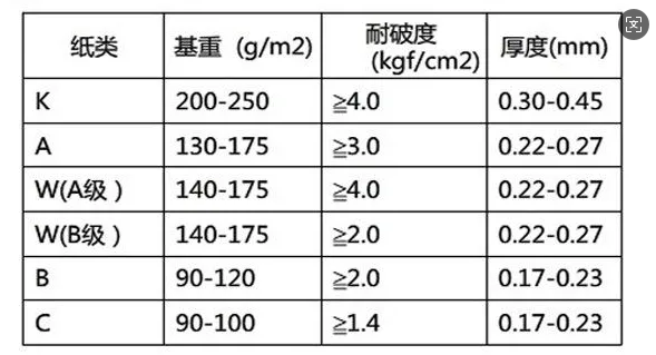 W:指白牛咭或普通(tōng)白咭:白牛咭基重(chóng)為135-185qsm;普通白咭基重為150-180gsm3或9:指芯紙基重為85q-180q(加強芯,普(pǔ)通芯(xīn),特(tè)別芯)。